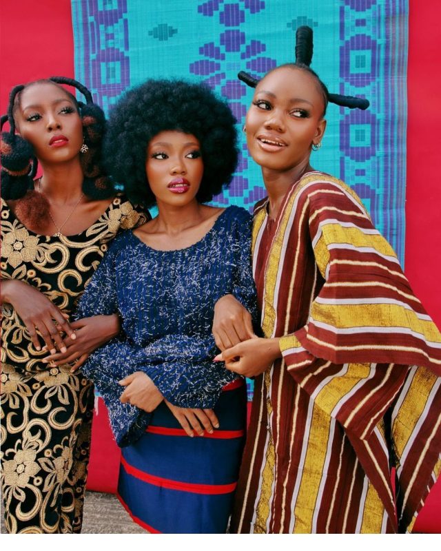 The styling is powerful and purposeful. The woman on the left exudes grace in a golden-embroidered gown with hair styled into thick loops reminiscent of traditional Yoruba threading (Irun Kiko). The centre figure commands attention with a voluminous afro, a nod to 70s Black pride and beauty movements. Meanwhile, the woman on the right dazzles in a brown-and-gold striped ensemble, her hair rising like a crown of geometric loops—bold, structured, and defiant of convention.