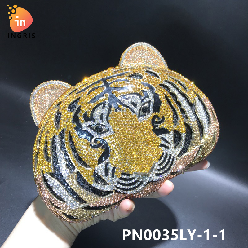 Unleash your wild side with this bold and glamorous Crystal Tiger Head Shaped Evening Clutch. Adorned with sparkling crystals in golden, black, and silver tones, this clutch captures the fierce beauty of a tiger, making it a statement piece for any special occasion. The intricately designed tiger face exudes strength and elegance, ensuring all eyes will be on you as you carry this stunning accessory.