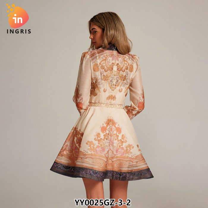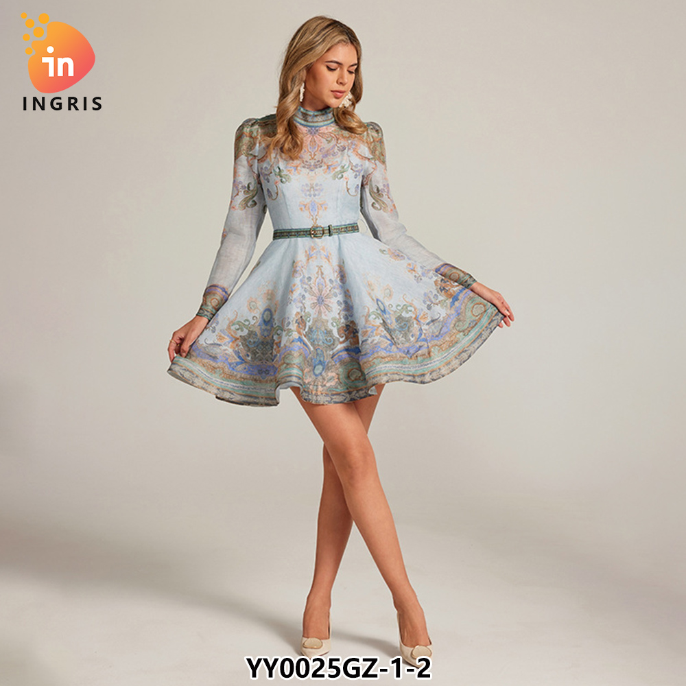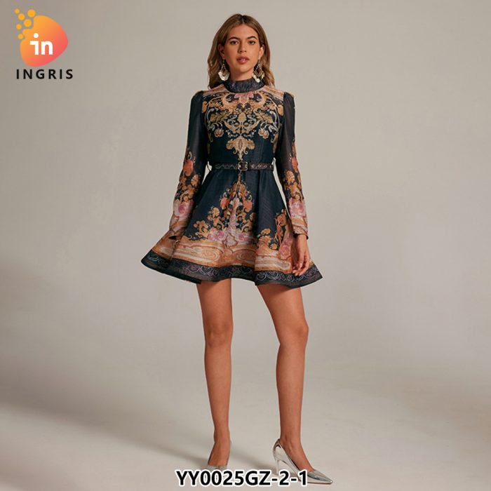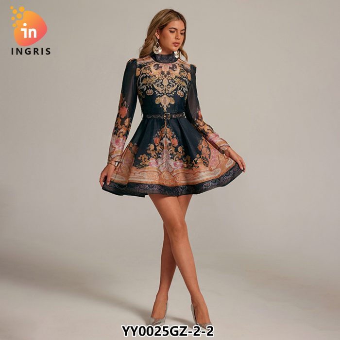 French Retro Standing Collar Lantern Sleeve Printed Dress for Women in Autumn New Collection Waist Slimming A-line Short Skirt-YY0025GZ