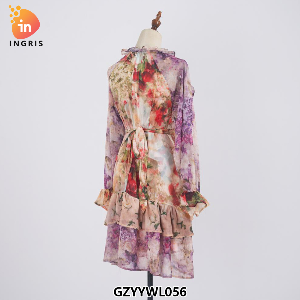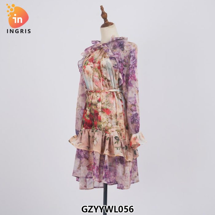 Modest Spring Casual Mandarin Collar Long Sleeves Floral Print Tiered Ruffles Chiffon Maxi Long Dress for Women-GZYYWL056