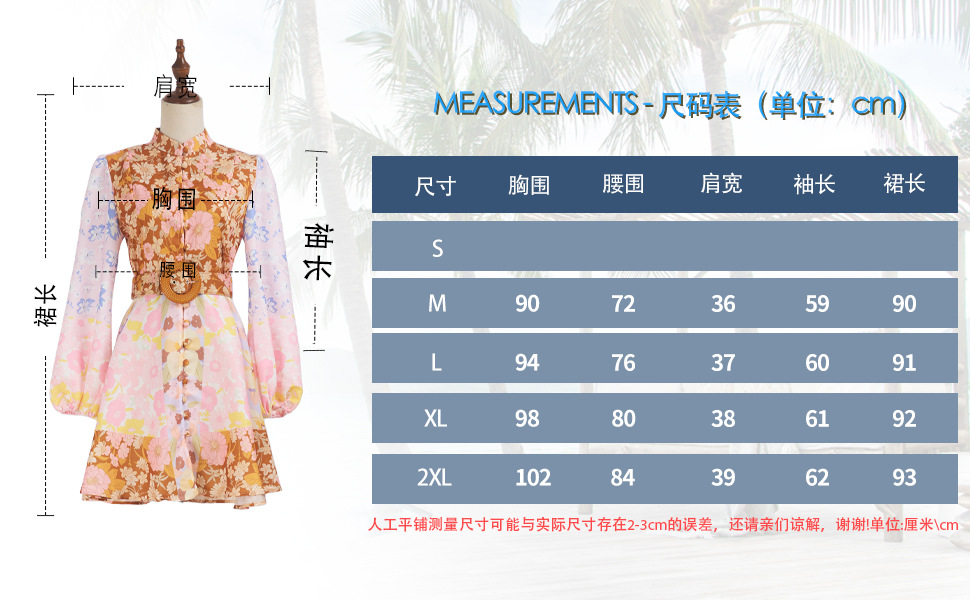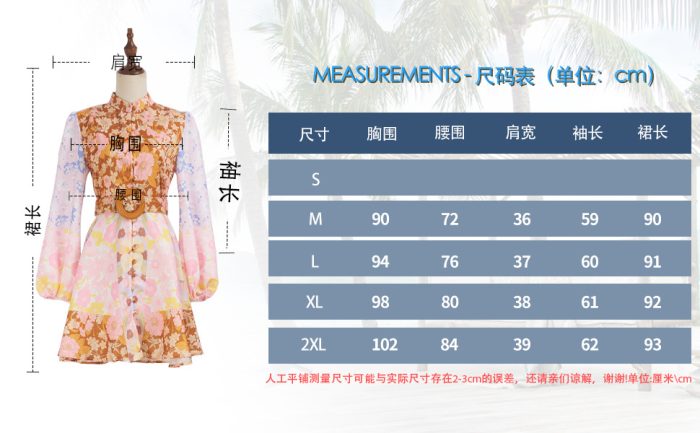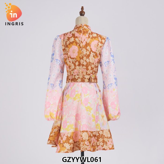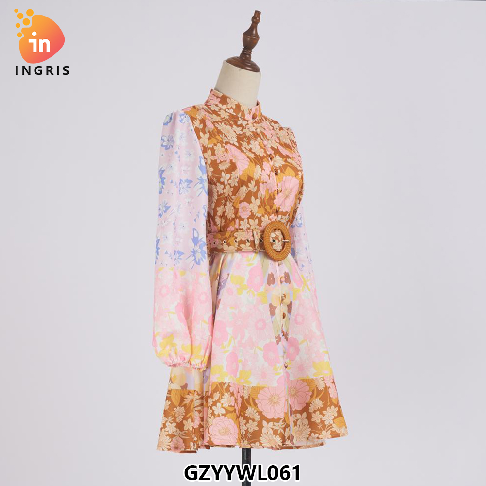 Spring/summer Thin Chic Stand-up Collar Single Breasted Lantern Long Sleeve Lace-up Waist Large Fold Hemline Printed Dress-GZYYWL061