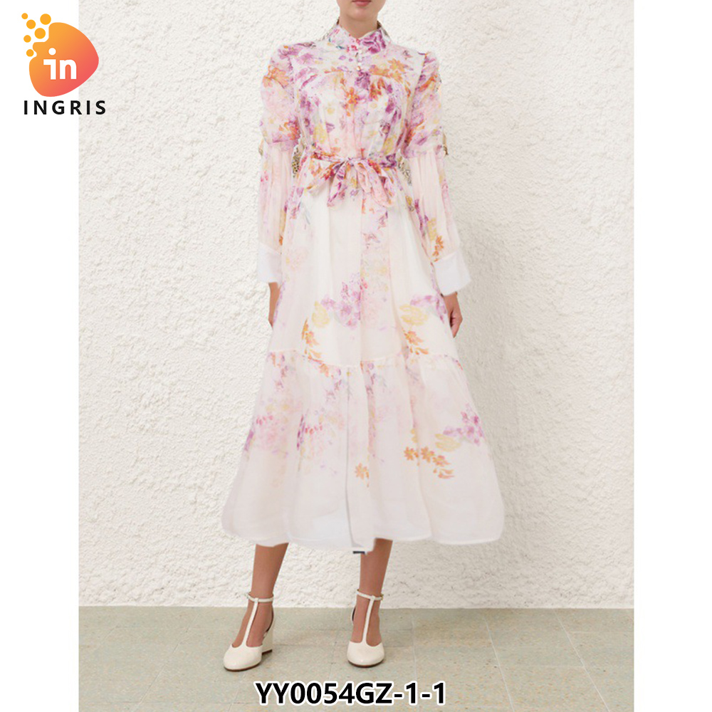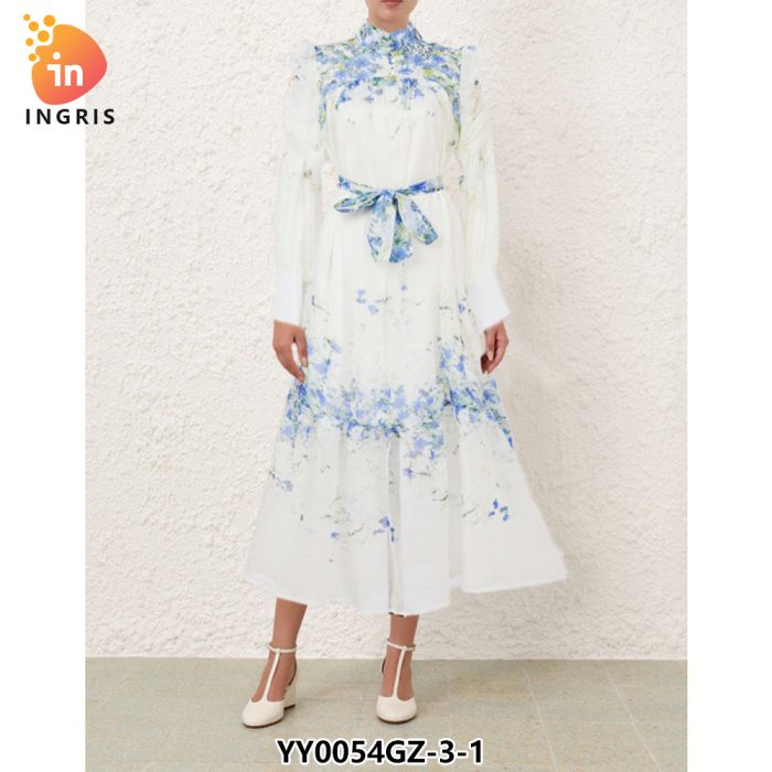 Crew Neck Floral Print Back Zipper Fly Long Sleeve Multi Color Casual Fashion Long Dress for Women-GZYYKJ014