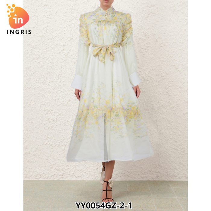 Stand Collar Tunic Bandage Casual Midi Dress for Women Long Sleeve Empire Printed Lace Dress Red Yellow-YY0054GZ